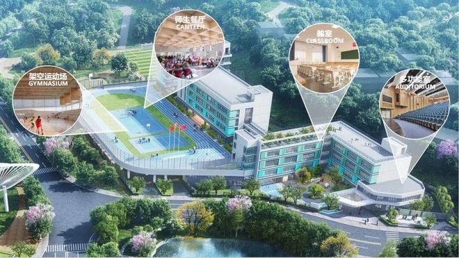 教育资源方面,越秀观樾相当给力。4 月 25 日,项目官宣引进广州天河外国语教育集团办学,配套的 24 班小学将由广州市天河外国语学校派出团队管理。从学校效果图能看到,新学校紧挨着月亮湖,依着山势而建,把山林湖的自然意境融入建筑当中,打造出一座充满 “自然教育” 氛围的现代山水书院。