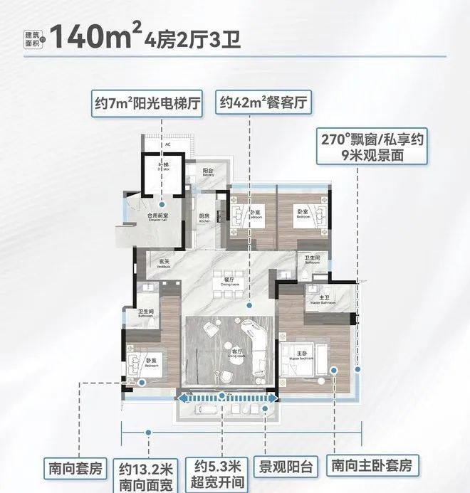 还有约 15 米转角阳台(可划分出不同区域),270° 环岛式景观阳台与绝美湖景融为一体,270° 观景边厅自带 IMAX 级巨幕视野,不管是在客厅沙发闲坐还是餐厅用餐,湖景园林和城市天际线都能映入眼帘。另外,它还采用分离式中西双厨加岛台的设计,多套房设计也大大提升了生活舒适度,主卧套房更是奢阔大气,有休息区、独立卫浴、步入式衣帽间,还有大面积飘窗拓展景观视野。