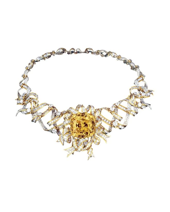她深谙“Less is more”的哲学,那条珠宝设计师 Jean Schlumberger特别为在电影宣传时设计的Tiffany缎带项链,在赫本的小黑裙经典演绎下,开启了Tiffany这颗珍稀黄钻的“传奇故事”。