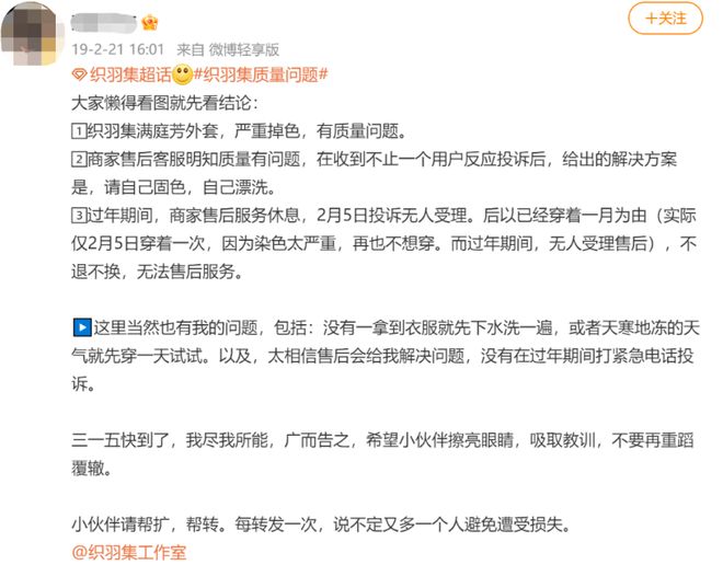 然而,“织羽集”关于性价比的争议始终如影随形。在“织羽集”的微博超话中,不少网友带着,反映服饰存在严重掉色、存在色差等多种问题。很显然,即便在平价时期,消费者对品牌“价值与价格是否匹配”的审视也从未停止。