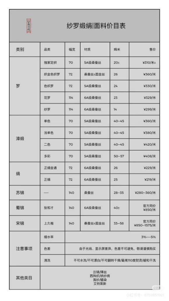 此外,《星岛》记者在搜索“真丝花罗面料”时发现,真丝花罗面料价格受原材料等级、工艺复杂程度所影响,主要价格区间在300元—800元/米。以小红书平台中某面料品牌的价格表为例,独家定制织款面料,采用5A级桑蚕丝,宽幅70厘米,售价可达310元/米;加入圆金丝的织金色织罗面料,宽幅72厘米,售价可达360元/米。