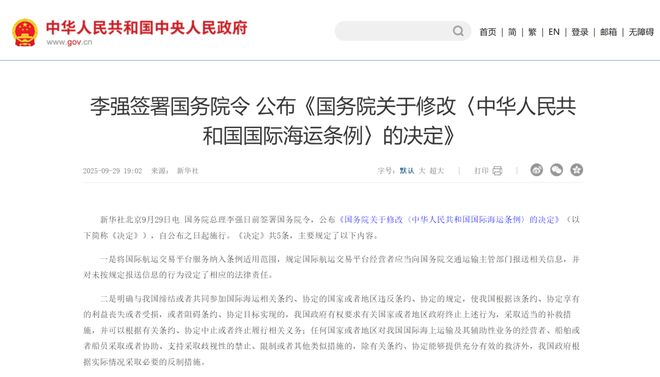 第一拳,打在规则反制上——中国国务院已于2025年9月29日正式修订《国际海运条例》,明确授权交通运输部门对任何国家对中国船舶、航运企业采取的歧视性措施,实施对等或超比例反制。这意味着:你收我50美元/吨,我也可以反收,甚至可以收得更多。